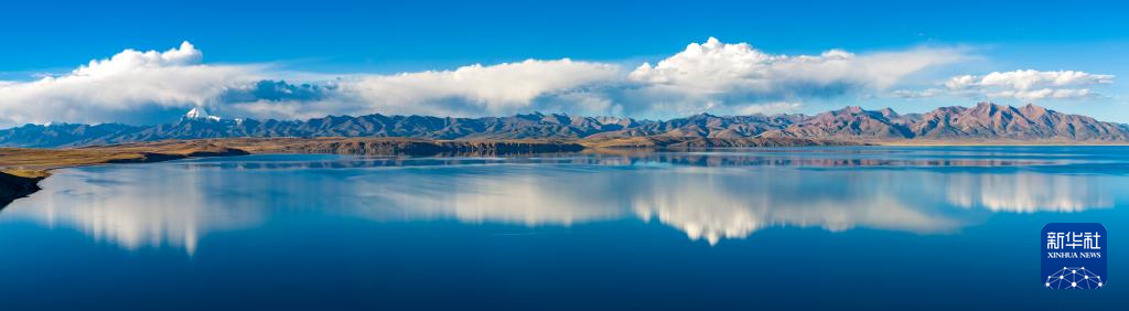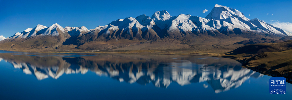 納木那尼雪山倒映在瑪旁雍錯(cuò)湖面上(無(wú)人機(jī)照片,9月13日攝)。新華社記者 姜帆 攝