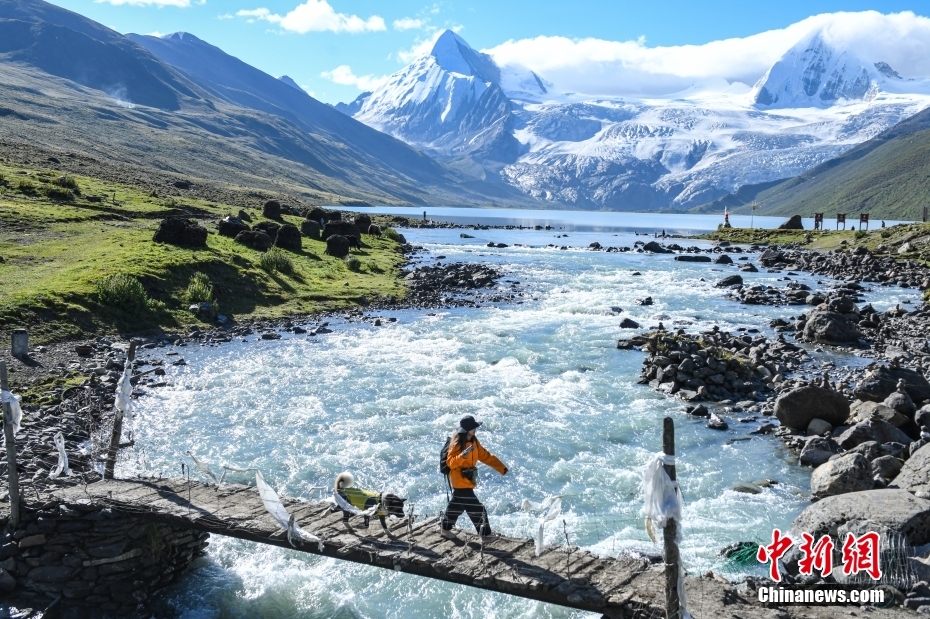 9月7日,在西藏那曲市比如縣境內(nèi)的薩普雪山,藍(lán)天、雪山、湖泊構(gòu)成一幅美麗的生態(tài)畫卷。圖為游客在薩普雪山腳下游玩。