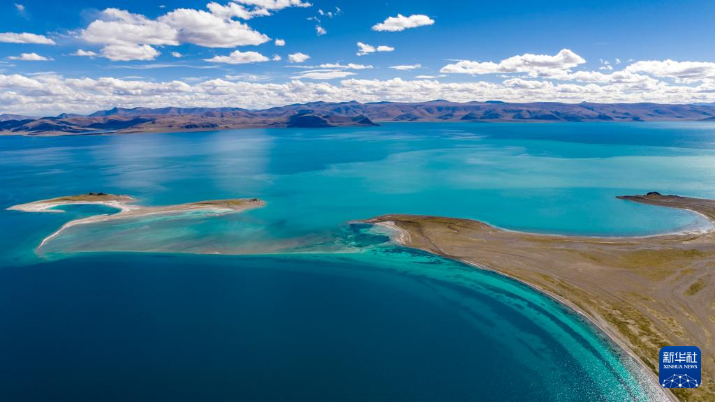 位于改則縣物瑪鄉(xiāng)的物瑪錯因水位下降被沙洲一分為二,湖面呈現不同顏色(無人機照片,9月24日攝)。新華社記者 姜帆 攝