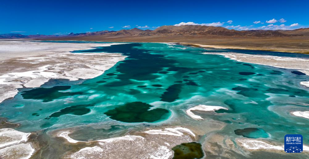 這是位于革吉縣鹽湖鄉(xiāng)的魯瑪仁布錯,湖畔白色地表為天然鹽礦(無人機照片,9月24日攝)。新華社記者 姜帆 攝