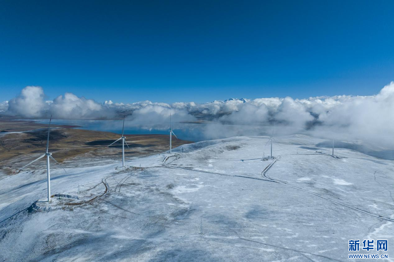 10月13日拍攝的西藏措美哲古風(fēng)電項目一處風(fēng)電機組(無人機照片)。新華網(wǎng) 旦增努布 攝