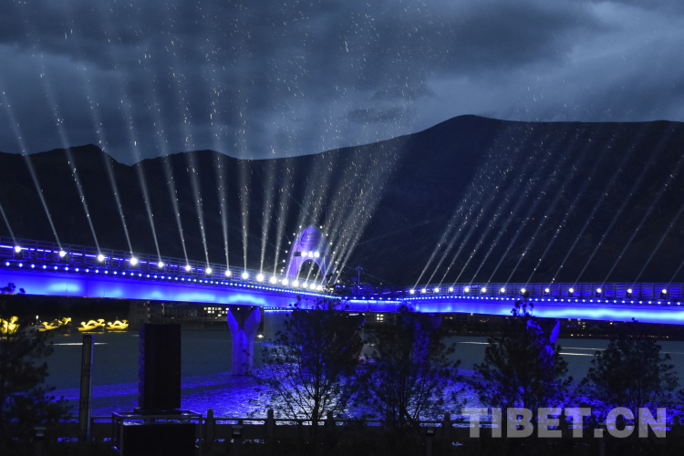 圖為在拉薩高新區(qū)舉辦的2023全球數(shù)字經(jīng)濟大會拉薩高峰論壇開幕式“數(shù)字之夜”城市脈搏點亮儀式 攝影:次旦拉姆