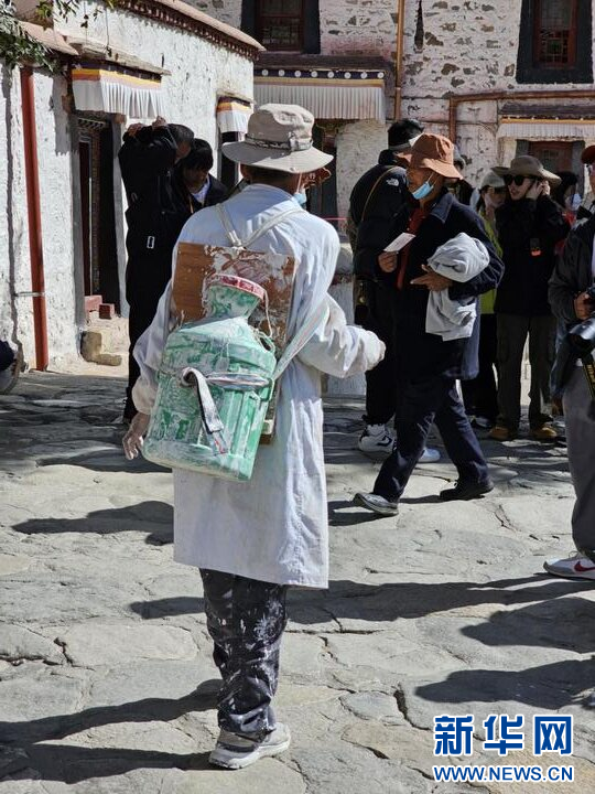 10月18日,布達(dá)拉宮“美容師”在噴灑涂料。新華網(wǎng) 柑丹鴦琦 攝 ??