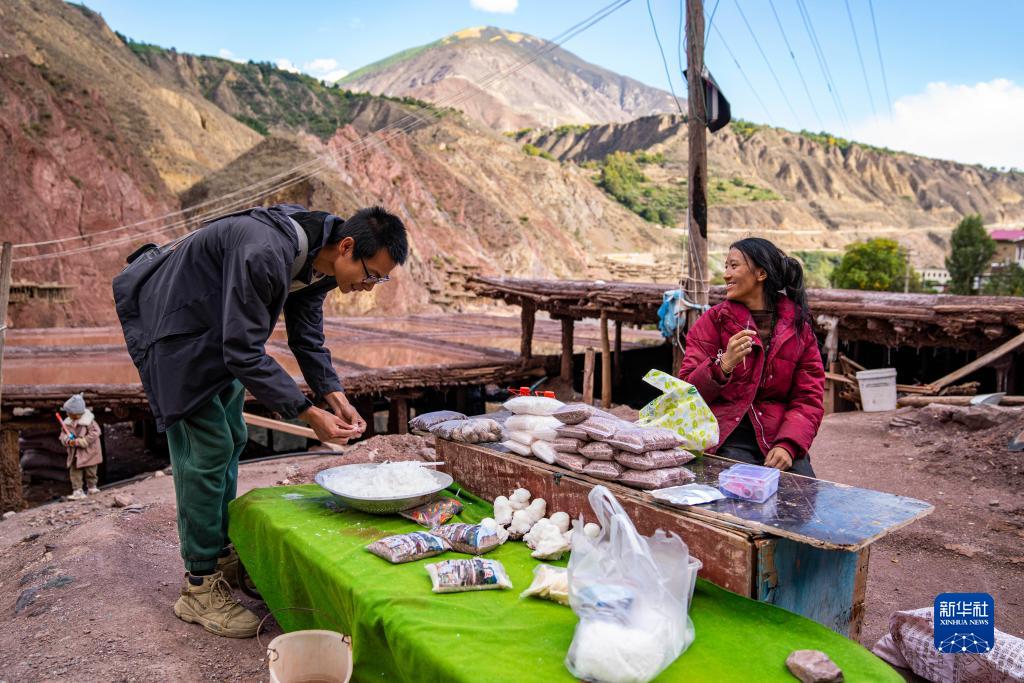 一名村民在西藏昌都市芒康縣納西民族鄉(xiāng)的鹽田旁向游客推銷(xiāo)自家產(chǎn)的鹽(10月20日攝)。新華社記者 孫非 攝