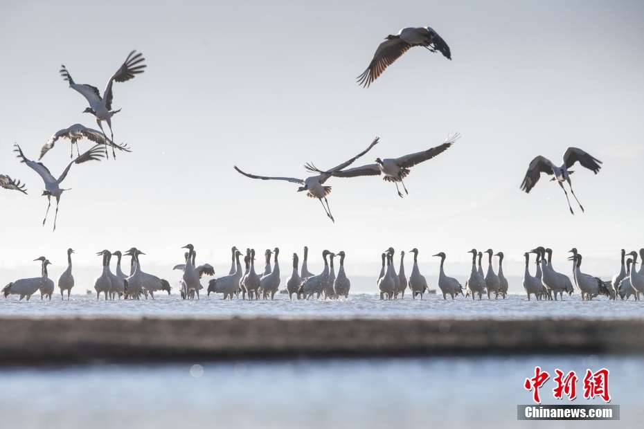 11月19日晨,西藏拉薩林周縣黑頸鶴保護(hù)區(qū)內(nèi),黑頸鶴覓食、嬉戲。拉薩北部的林周縣平均海拔約4200米,是黑頸鶴的主要越冬地之一。目前,到林周縣越冬的黑頸鶴已達(dá)2000只左右。