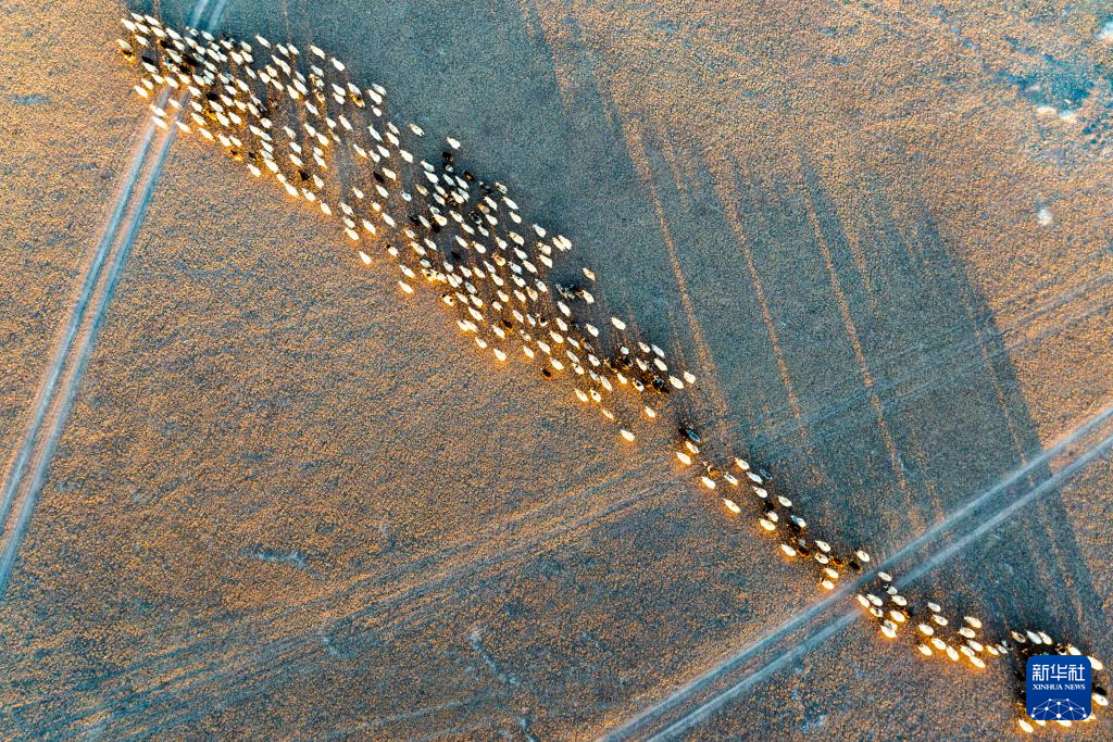 太陽(yáng)落山,丹增家的羊從草場(chǎng)趕回棚圈(無人機(jī)照片,12月18日攝)。新華社發(fā)(旦增努布攝)