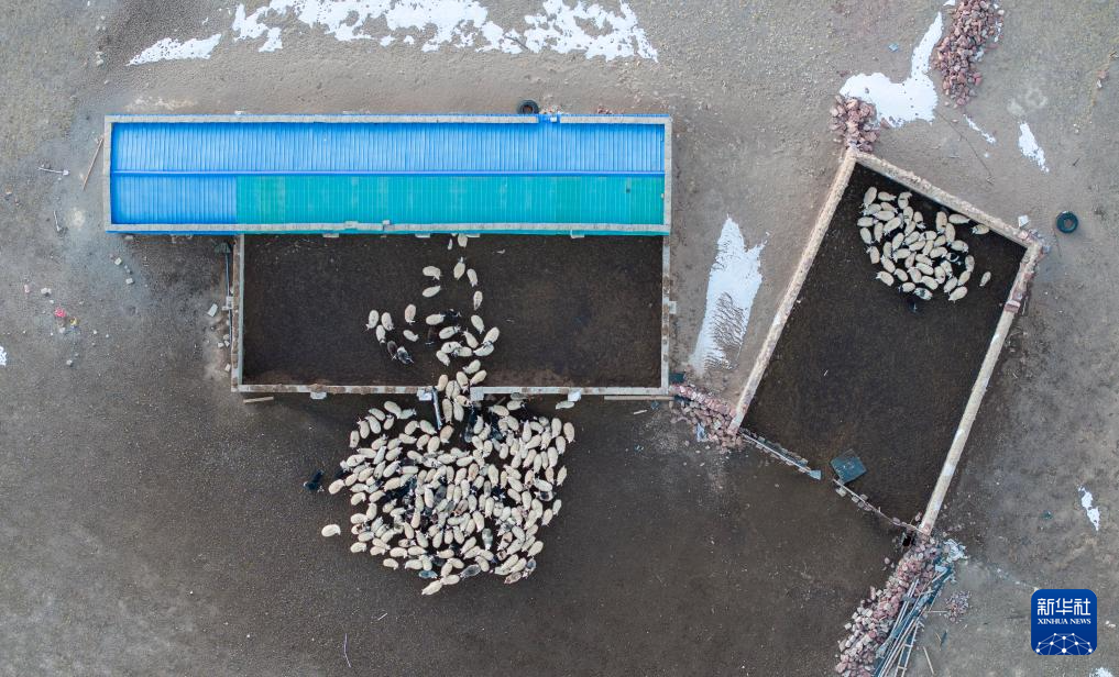 太陽(yáng)落山,丹增家的羊回到棚圈。其中左側(cè)藍(lán)頂?shù)氖侨ツ晷律w的封閉式棚圈,右側(cè)是傳統(tǒng)的敞開式羊圈(無人機(jī)照片,12月18日攝)。新華社記者 姜帆 攝
