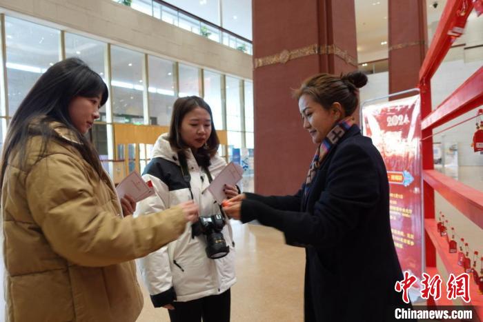 當(dāng)日上午,西藏博物館中央大廳聚集了許多參加現(xiàn)場活動(dòng)的游客。游客以隨機(jī)抽福袋、領(lǐng)獎(jiǎng)品的形式參與活動(dòng)。參與者紛紛表示在新年的第一天開展這樣的活動(dòng)很有意義。針對元旦期間來館參觀的游客,西藏博物館還制作有館藏文物元素的主題紀(jì)念賀卡供游客留念。
