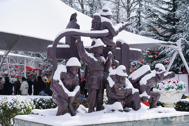 第二站,銅牛廣場。銅牛廣場位于布達(dá)拉宮西南方向約300米處,北京中路與林廓西路在此相交。這里是開放式的人行道,非常開闊,是通往布達(dá)拉宮廣場的必經(jīng)之路,很多人都在此合影留念。雪中的銅牛披上了白色的“外衣”,更加體現(xiàn)出“憨厚、忠誠、悲憫、堅韌、勇悍、盡命”的牦牛精神。