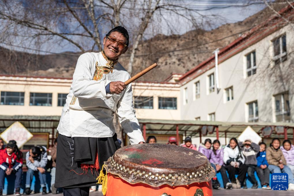 在西藏昌都市洛隆縣碩督鎮(zhèn)小學,鄧巴阿尼在擊鼓伴奏(1月19日攝)。新華社記者 丁增尼達 攝