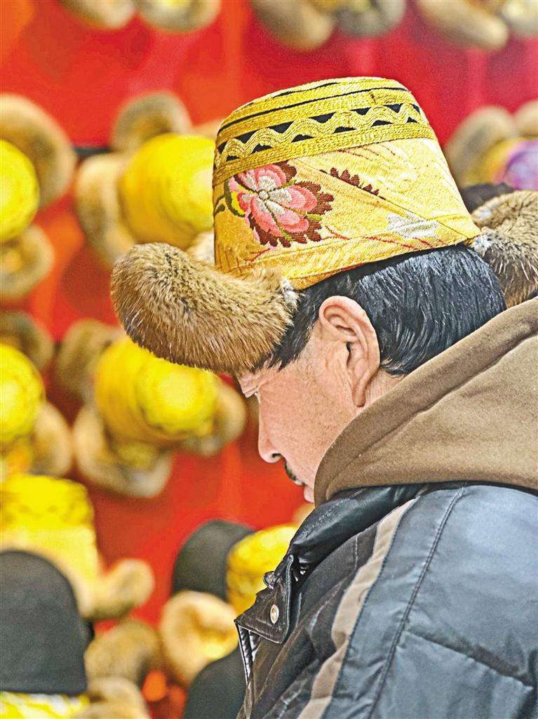 拉薩市民在試戴藏式禮帽。 記者 格桑倫珠 攝