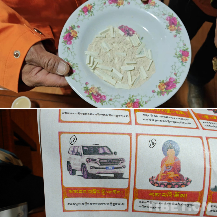 為了增添一些節(jié)日的氣氛,幾位道班大哥為我們準(zhǔn)備了別具特色的“抽簽”式古突。大家從盤(pán)子里抽取印有數(shù)字的標(biāo)簽紙,然后根據(jù)數(shù)字從解析書(shū)里找出對(duì)應(yīng)的圖案和文字解釋?zhuān)⒁庵履陼?huì)有不同的收獲。兩位同事抽到了取火器和黃財(cái)神,解讀說(shuō)是能干和發(fā)大財(cái)。而我抽到了一輛“霸道車(chē)”,道班大哥說(shuō)意味著新的一年我能去周游世界。每抽完一個(gè)簽,大家都會(huì)叫好和鼓掌,給抽簽人送去美好的新年祝福。