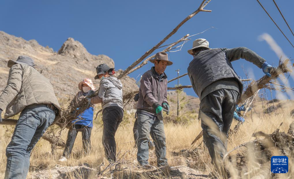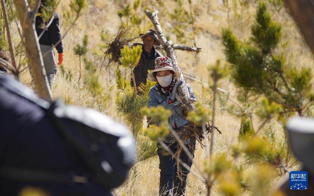 3月12日,東嘎社區(qū)二組村民在搬運(yùn)樹(shù)苗。新華社記者 丁增尼達(dá) 攝 ??