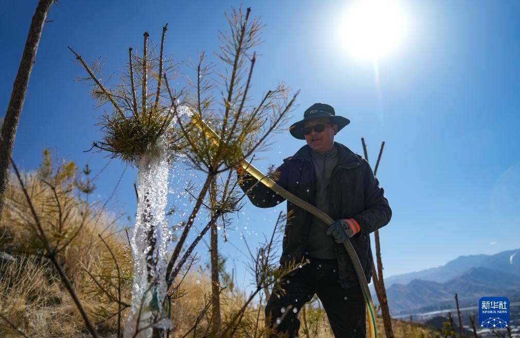 3月12日,東嘎社區(qū)二組村民在給樹(shù)苗澆水。新華社記者 丁增尼達(dá) 攝 ??