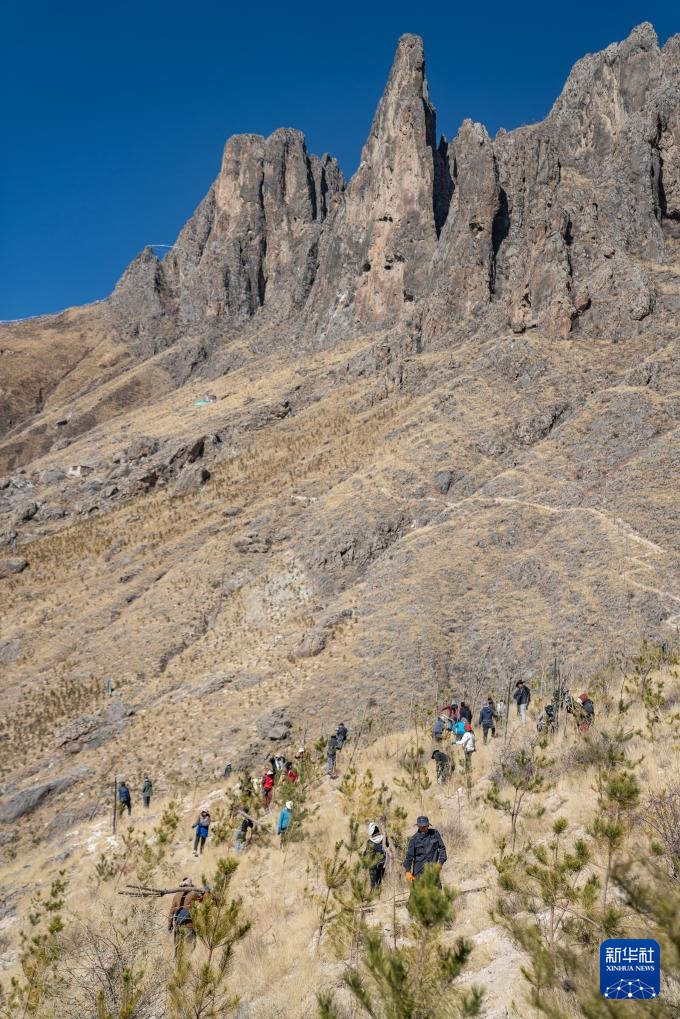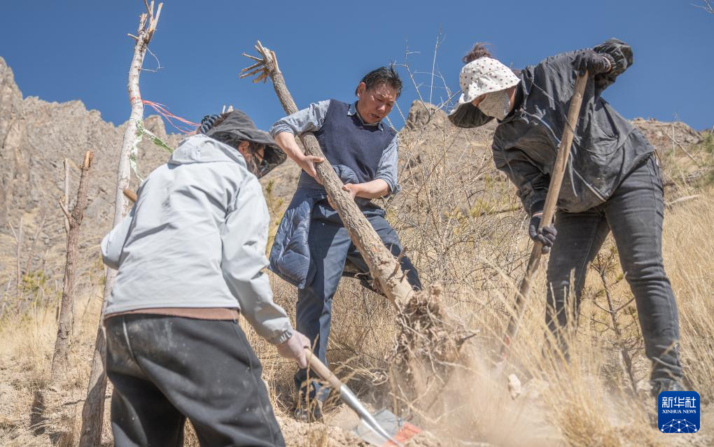 3月12日,仁增(中)和東嘎社區(qū)二組村民在植樹(shù)。新華社記者 丁增尼達(dá) 攝 ??