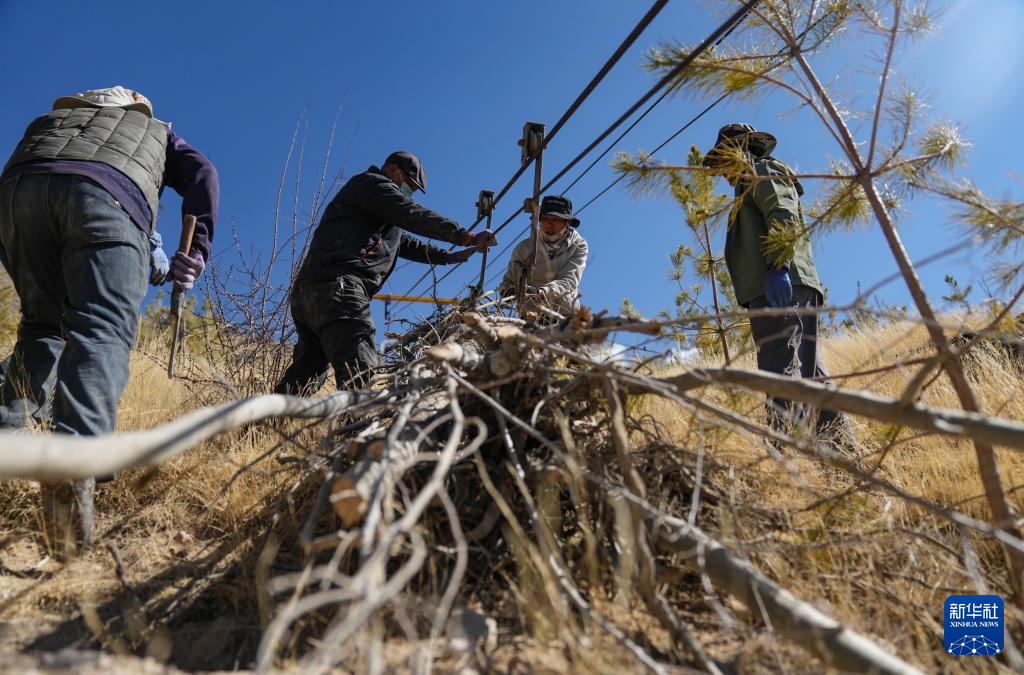 3月12日,東嘎社區(qū)二組村民在通過(guò)索道運(yùn)輸樹(shù)苗。新華社記者 晉美多吉 攝 ??