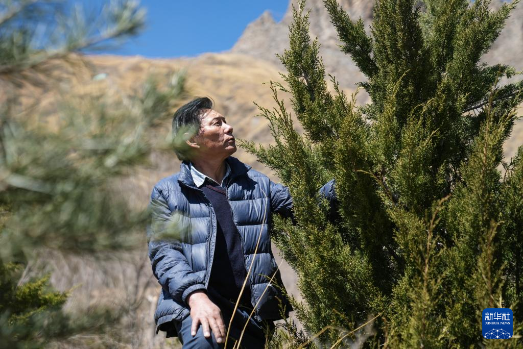 3月12日,東嘎社區(qū)二組組長(zhǎng)仁增在查看樹(shù)苗長(zhǎng)勢(shì)。新華社記者 晉美多吉攝 ??