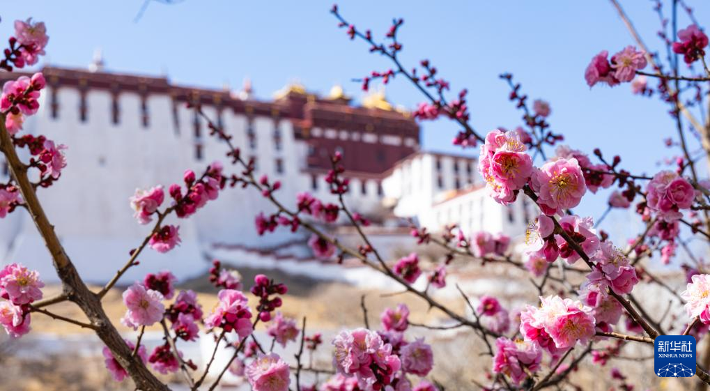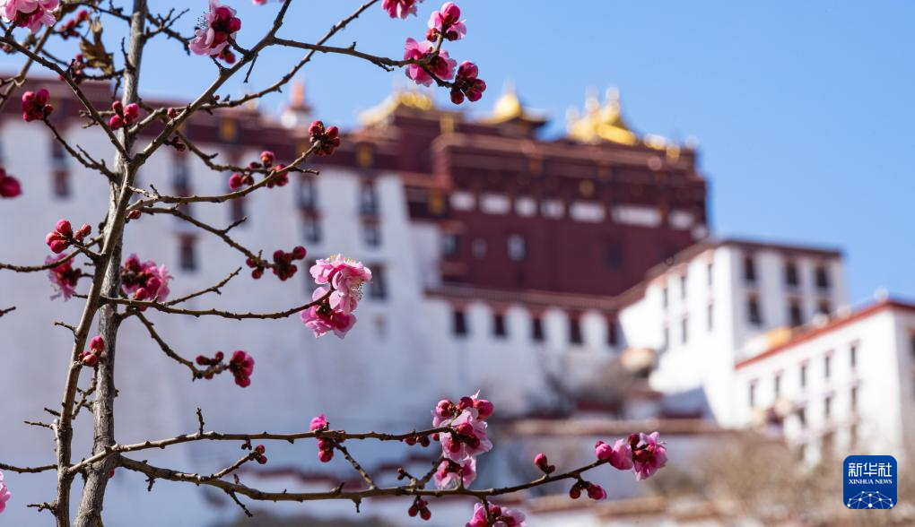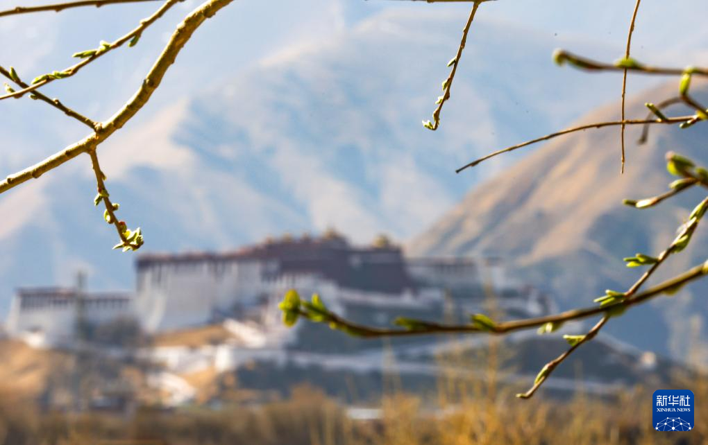 3月14日從拉薩市宗角祿康公園拍攝的春日布達拉宮一角。新華社記者 丁增尼達 攝