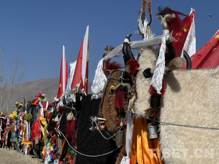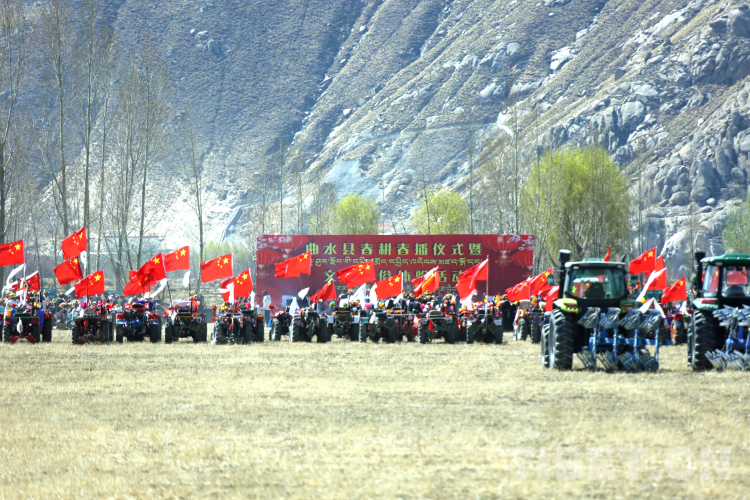 整個(gè)活動充滿儀式感。村民們先是來到田地中央燃桑香、獻(xiàn)貢品,祈求風(fēng)調(diào)雨順、無災(zāi)無害、莊稼豐收。開耕第一犁在吉祥喜慶的藏戲《扎西雪巴》表演中拉開了序幕,一輛輛插著五星紅旗,用五彩哈達(dá)、花朵、吉祥圖案裝扮一新的拖拉機(jī)一字排開,涌向待墾的農(nóng)田進(jìn)行翻耕,播撒第一粒種子。