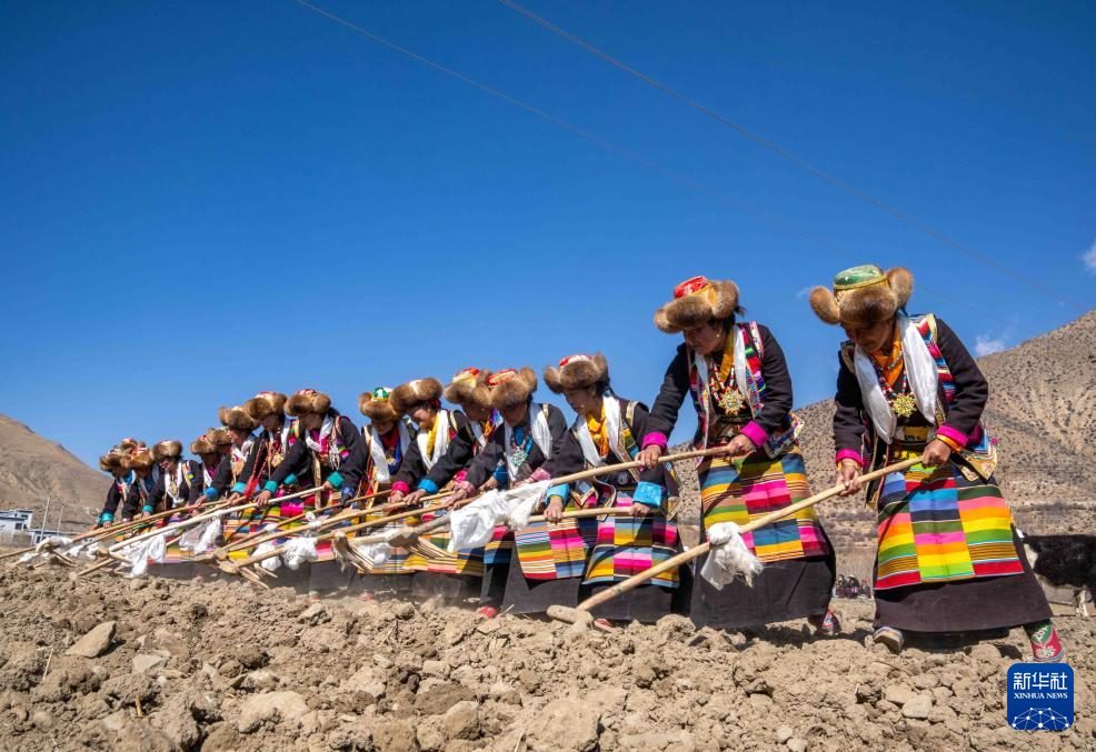 當(dāng)日是西藏農(nóng)民舉行一年一度春耕大典的日子。村民沿襲著傳承千年的春耕民俗,身著節(jié)日盛裝,手捧“切瑪”(五谷豐登斗),唱起祈愿歌,互敬青稞酒。當(dāng)鐵犁翻開土地,婦女將手中的種子撒下,祈求新的一年豐收?! ??