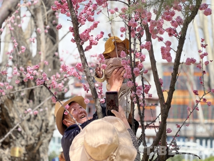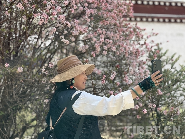 圖為3月19日,拉薩市民在布達拉宮腳下的宗角祿康公園里賞花并拍照留念 攝影:德吉卓瑪