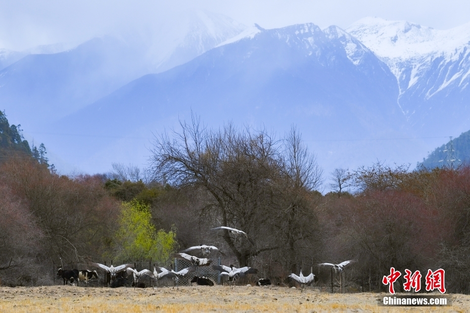 西藏林芝:黑頸鶴與雪山共舞