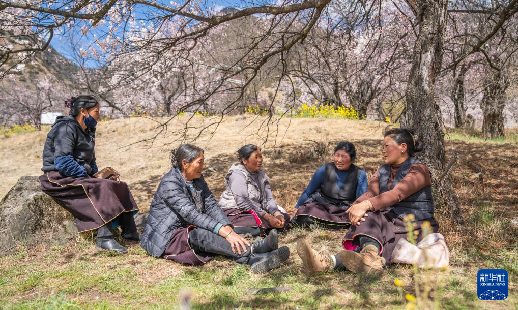 午休時(shí),尼瑪曲吉(右二)與村民在桃樹下聊天(4月1日攝)。新華社記者 丁增尼達(dá) 攝