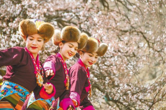 圖為演職人員在桃花樹下翩翩起舞。記者 扎西頓珠 旦增嘎瓦 攝
