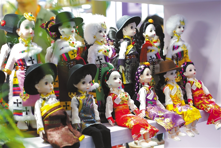 在國(guó)貨特色潮品展區(qū)西藏展臺(tái)拍攝的人偶。新華社記者 田薇薇 攝