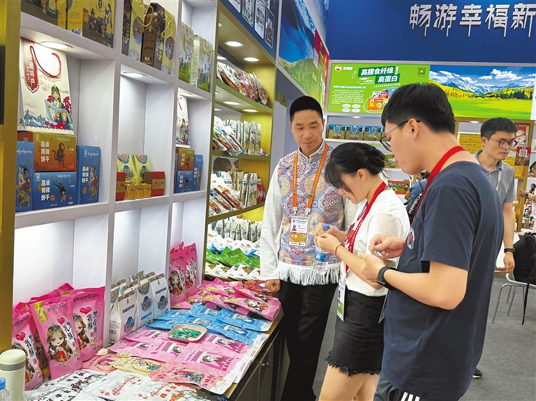走進(jìn)展館內(nèi),琳瑯滿目、色彩鮮艷的雪域高原特色產(chǎn)品整齊擺放在展館架上,吸引了眾多客商和顧客前來(lái)咨詢。