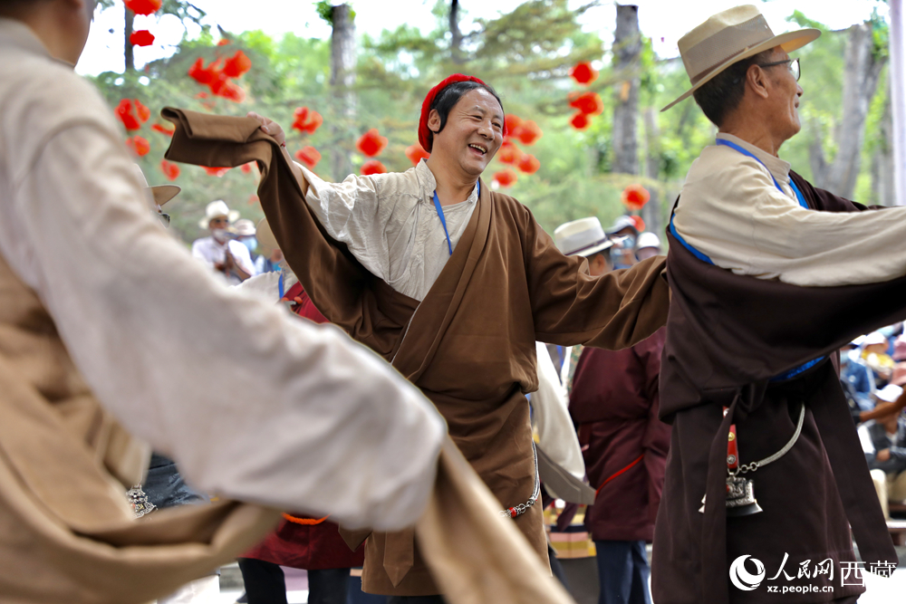 拉薩布達(dá)拉宮腳下的宗角祿康公園民俗活動(dòng)區(qū)里,市民們在這里載歌載舞。人民網(wǎng)記者 次仁羅布攝