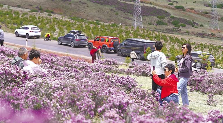 圖為游客在杜鵑花海中玩賞。扎西 記者 萬慧 攝