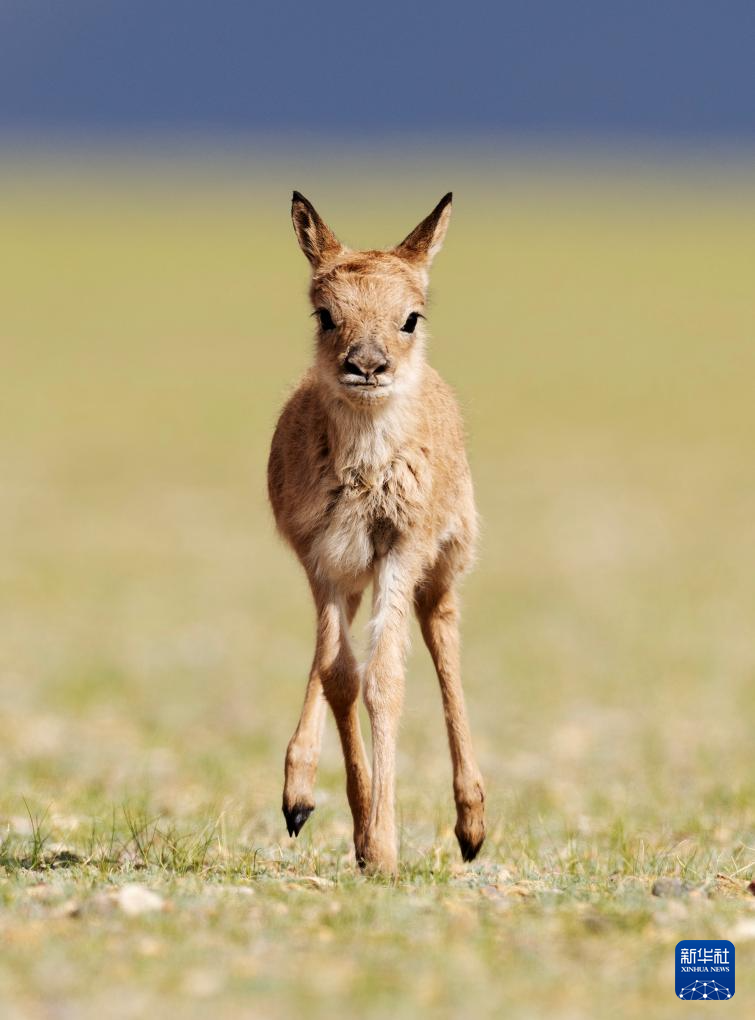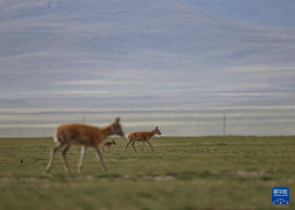6月17日,在魯確塘草原,一只剛出生不久的小藏羚羊跟著母藏羚羊在草原上漫步。新華社記者 費茂華 攝