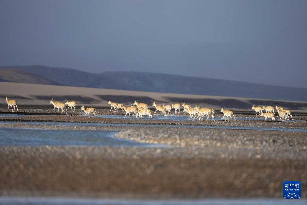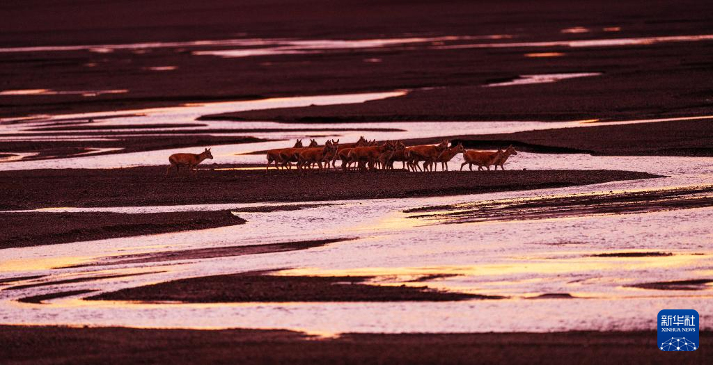 落日余暉中大群遷徙的藏羚羊行進在甜水河畔的荒灘上(6月13日攝)。新華社記者 姜帆 攝