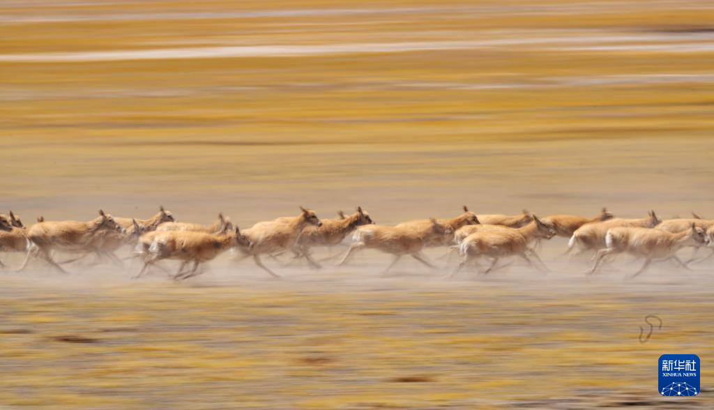 幾只公藏羚羊守護母藏羚羊前進(5月8日攝)。新華社記者 姜帆 攝