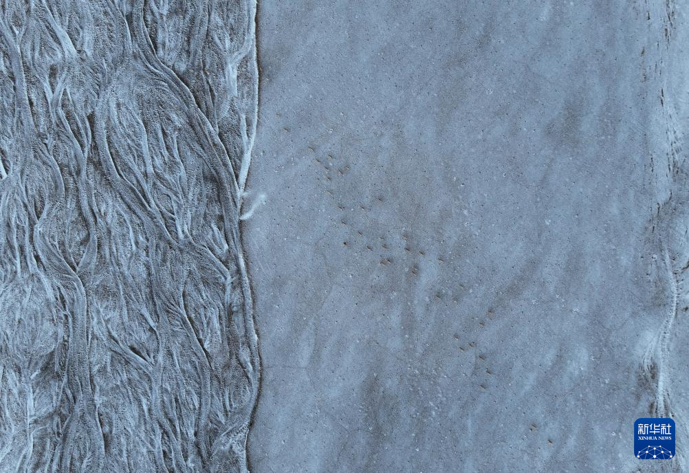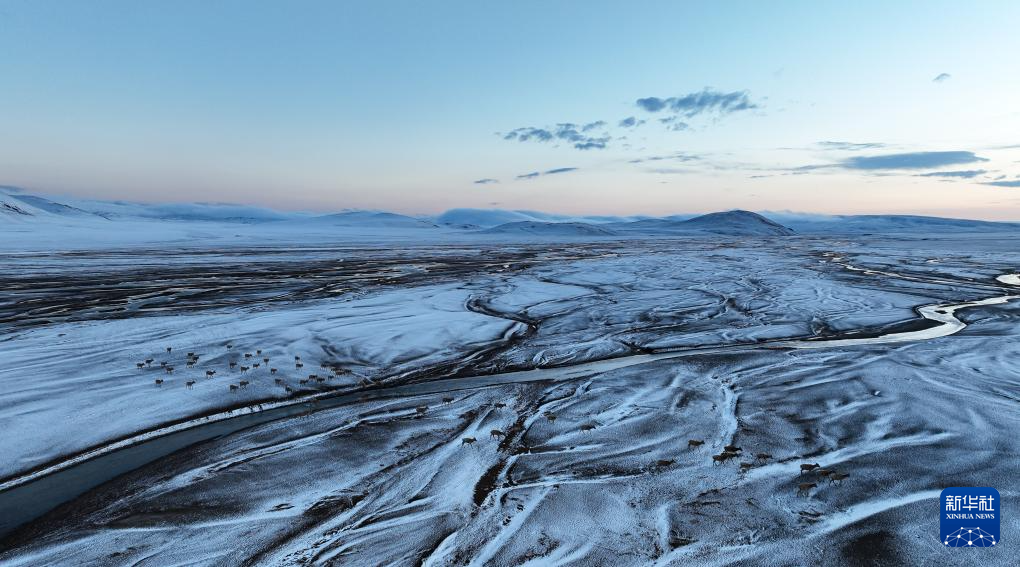 在甜水河畔荒灘雪地中向產羔地遷徙的藏羚羊(6月14日攝,無人機照片)。新華社記者 普布次仁 攝