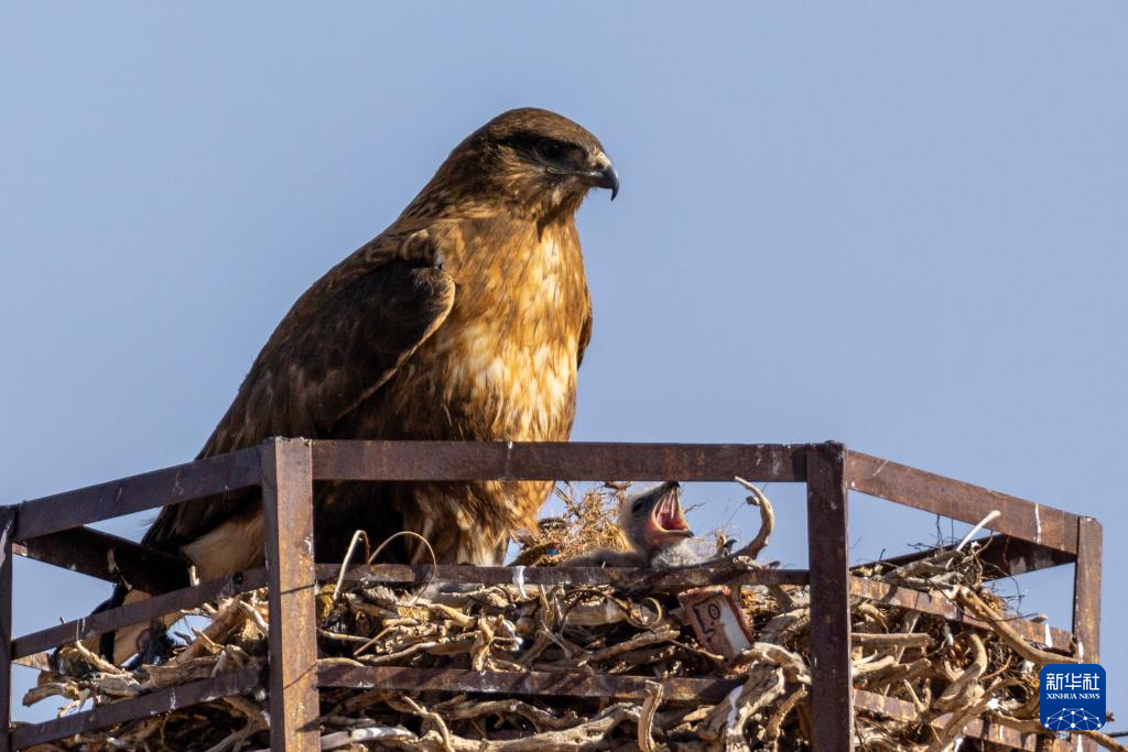 一只游隼與其雛鳥在鷹架上的巢中(6月8日攝)。新華社記者 姜帆 攝