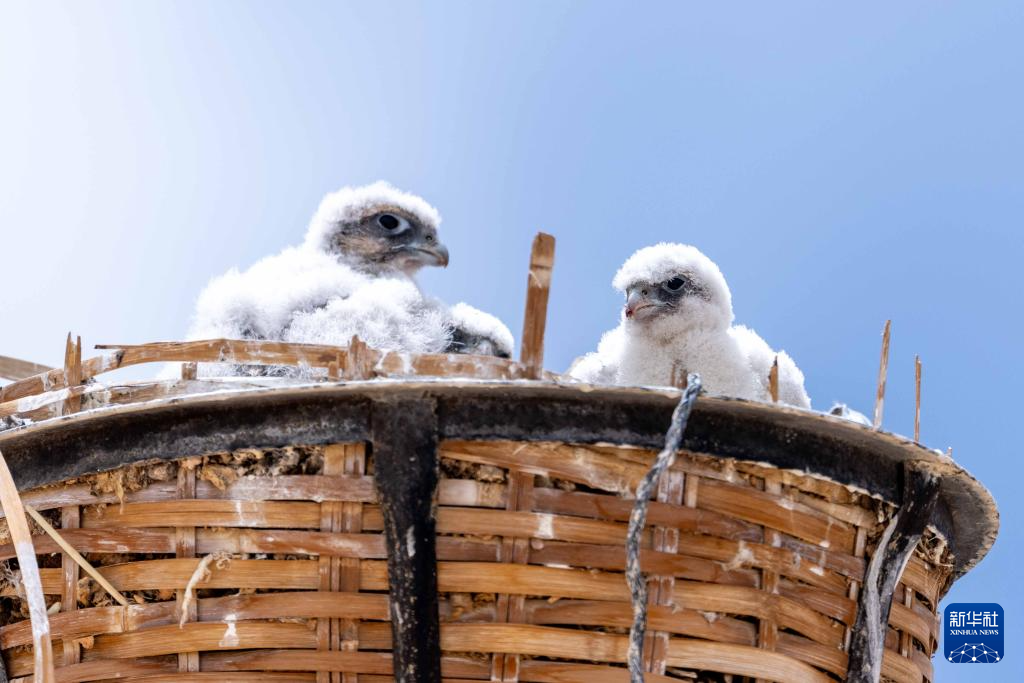 6月7日拍攝的在鷹架上巢中棲息的游隼雛鳥。新華社記者 旦增尼瑪曲珠 攝 ??