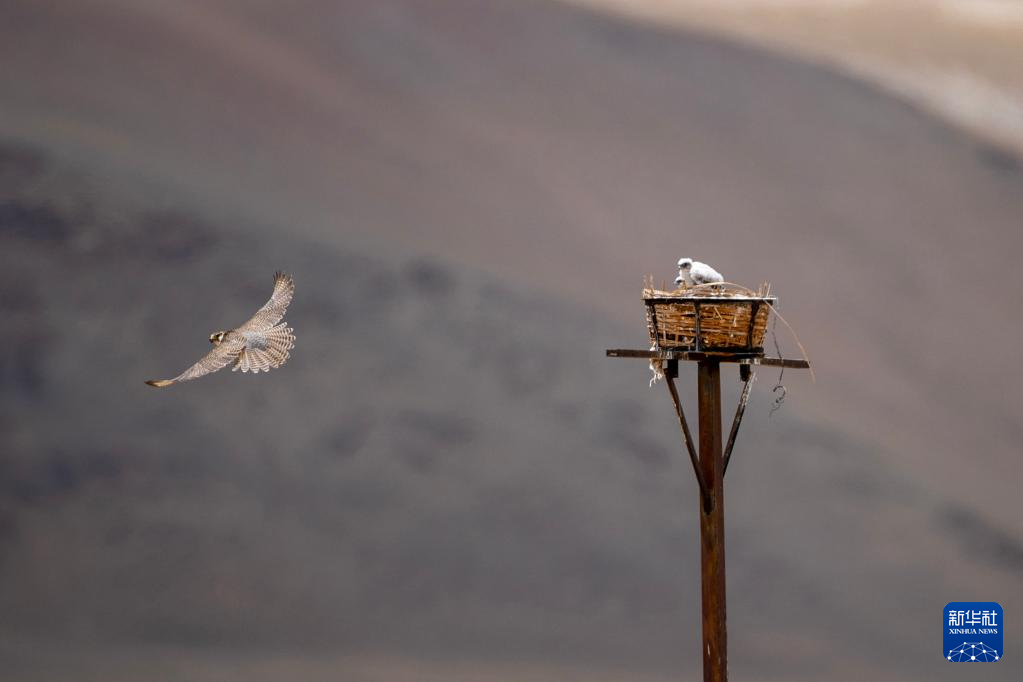 在羌塘草原, 一只游隼飛離鷹架上的巢(6月7日攝)。新華社記者 姜帆 攝