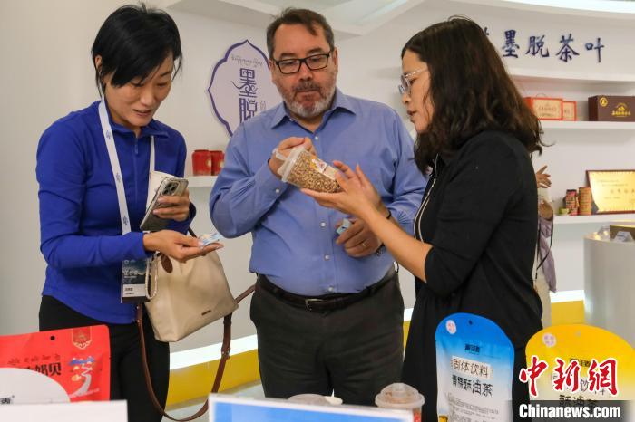 圖為6月28日,智利駐華大使巴勃羅·阿里亞蘭(中)在林芝經(jīng)濟開發(fā)區(qū)參訪時品嘗青稞食品。中新社記者 江飛波 攝