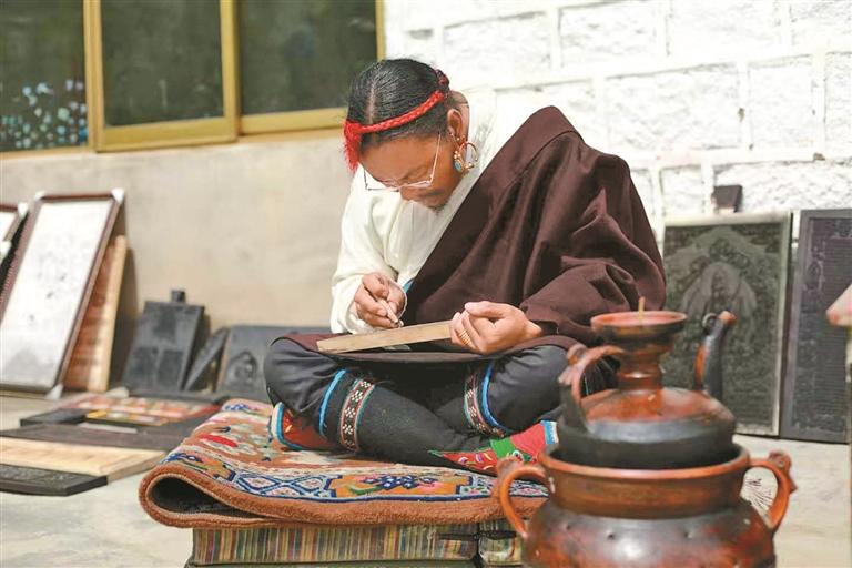 在傳承技藝的過程中,斯曲也面臨著不少挑戰(zhàn)。教徒弟時最大的困難就是讓他們靜下心來,因為這門手藝需要從小學(xué)起,不僅要學(xué)習(xí)拿工具,還要學(xué)習(xí)認(rèn)字和雕刻?!耙郧肮馐菍W(xué)習(xí)雕刻文字,起碼要9個月時間,現(xiàn)在的孩子都很聰明,兩年基本就能掌握雕刻技藝?!彼骨牢康卣f。