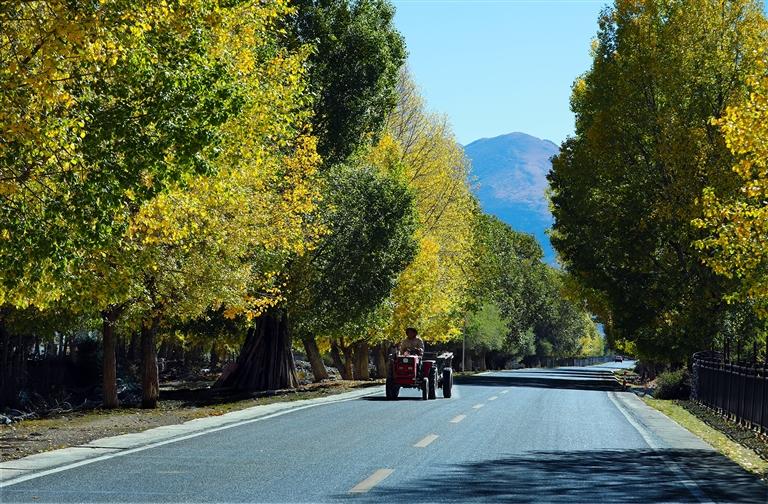 沿著318國(guó)道向東南方向行進(jìn)至拉薩市墨竹工卡縣日多鄉(xiāng),沿途秋景宛如大自然不慎打翻的調(diào)色盤,濃烈的色彩撲面而來(lái),讓人還沒來(lái)得及細(xì)細(xì)品味,便已深深沉醉其中。