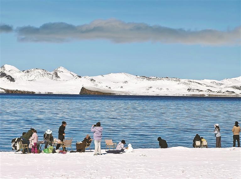 林芝市工布江達(dá)縣新錯(cuò)湖畔,游客在雪景中打卡留念,盡享高原湖光山色。記者 次仁平措 攝