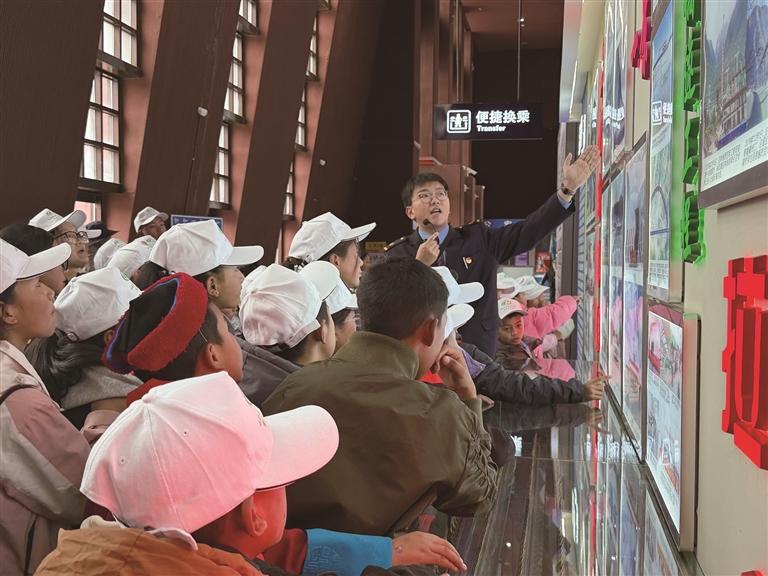 “這條全長435.48公里的鐵路,橋隧比高達75%,結束了藏東南地區(qū)不通鐵路的歷史!”隨著工作人員的講解,同學們的目光追隨著沙盤上的鐵軌延伸,理解了這條鐵路修建的困難程度,更讀懂了這條鐵路對“加強聯(lián)系交流、維護民族團結”的重要意義。