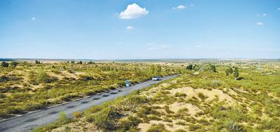 登上杭錦旗第一條穿沙公路旁的防火瞭望塔,四下遠望,只見公路兩側的沙地,被沙生植物覆蓋起來。這條全長115公里的黑色柏油路,從杭錦旗錫尼鎮(zhèn)出發(fā),猶如一把利劍,直插庫布其沙漠腹地,硬生生將沙漠攔腰劈斷。