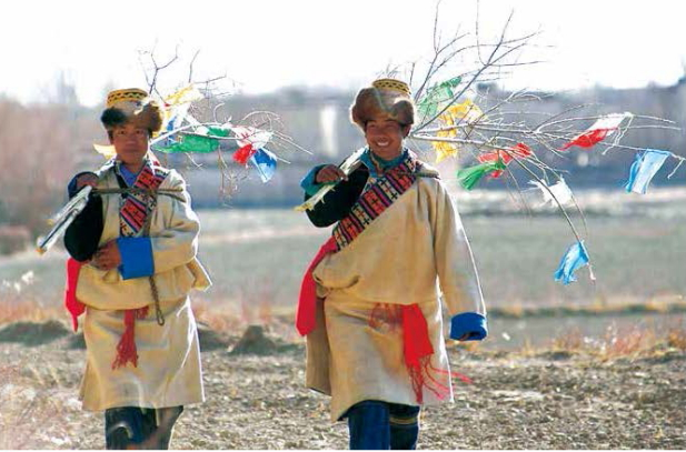 藏歷正月初三,又是一個(gè)激動(dòng)人心的日子,這一天清早起來(lái),家家戶戶到屋頂“煨桑”。煨為漢語(yǔ),是燃燒不見(jiàn)火焰的意思,“?!笔遣卣Z(yǔ),是冒煙的意思,有人譯成“燒煙煙”、“燒神煙”,主要是煨燒香草和松枝柏葉升起裊裊香煙,驅(qū)除人間的污濁和瘟疫,祭祀鄉(xiāng)士神靈和護(hù)法神靈。接著,拔除屋頂去年插的經(jīng)幡,重新插上新的經(jīng)幡。經(jīng)幡是五種顏色的印滿經(jīng)文的布,固定在長(zhǎng)長(zhǎng)的柳樹枝上。據(jù)說(shuō)紅色象征火焰,黃色象征土地,藍(lán)色象征天空,白色象征云彩,綠色象征江河。還有一種說(shuō)法,五種顏色分別代表金、木、水、火、土五行。煨桑插旗后,人們一邊揚(yáng)撒糌粑,一邊高喊:“吉吉!索索!拉結(jié)羅!”(意思是供祭啊,供祭啊,神勝利了?。├_古城的房子都是平頂?shù)?,房舍屋宇緊緊相連。這一天成百上千的人,都站在屋頂上揚(yáng)撒糌粑,更換彩幡。糌粑粉如大雪紛飛,彩幡如鮮花怒放,祭神的呼聲此起彼伏,整個(gè)拉薩古城都成了神圣的祭壇,到處彌漫著熱烈的氣氛。