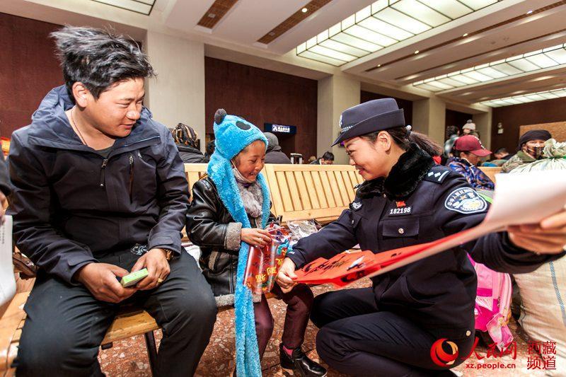 按照“平安出行、有序出行、溫馨出行”工作目標,拉薩鐵路公安處組織全處各單位干部民警共計60余人分別在西藏各火車站,緊緊圍繞“服務旅客為宗旨,待旅客如親人”的理念,開展了春運首日暨“一路溫馨一路情 天路鐵警伴您行”主題系列活動。圖為拉薩鐵路公安處民警(右一)向“小旅客”發(fā)放春聯(lián)。圖片來源:人民網(wǎng)