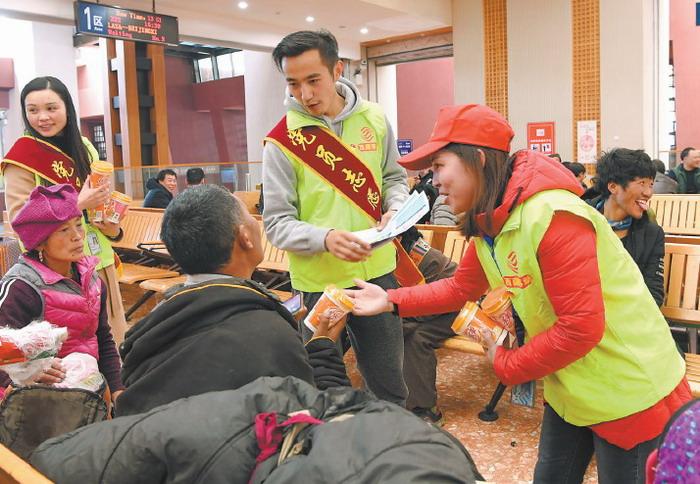 拉薩火車站團委聯(lián)合中國移動西藏公司開展“黨團志愿者愛心送溫暖 服務春運返鄉(xiāng)農(nóng)民工”主題活動,一個個黨團員志愿者的身影在候車室里忙碌著。圖為2月1日,中國移動西藏公司的志愿者正在拉薩火車站候車室給旅客發(fā)放奶茶、礦泉水。 圖片來源:西藏日報 李洲 攝