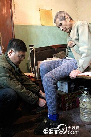 養(yǎng)父因腦溢血偏癱在床,孔令凱每天幫他活動(dòng)手指。袁育堃 攝