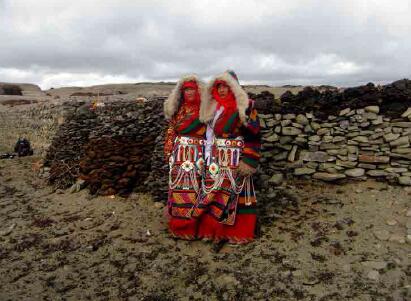 瑪旁布姆卡是西女國女王居住的城堡,普蘭縣文化局局長加措根據(jù)藏文大字典和《阿里史地探秘》的“瑪旁布莫卡”,解釋出“布”的漢文詞義,就是女人、女性、女子或者女王?!澳本褪窍悴莼蛘呦悴荼椴即松健?jù)當?shù)匕傩战榻B,城堡遺址坐落在普蘭神湖瑪旁雍措湖的東部扎藏布溫泉溝南側(cè)的野嶺上,海拔5000米上下。在遺址上部高處還有一個碩大蘑菇形狀的巖石巋然迎風屹立城堡上方,與下方城堡遺址交相輝映。這即是“出俞石、朱砂、麝香、牦牛、駿馬、蜀馬,尤多鹽,恒將鹽向天竺興販,其利數(shù)倍”西女王國的王城。在城堡上方更高處的山后,遺留有眾多的洞穴,說明女國的百姓就居住在女王的周圍。此外在山坡的下方扎藏布溝處,當?shù)匕傩辗Q這塊地方為“卡爾青”,意思是大城堡之地。盡管史書上的記載十分有限,瑪旁布姆卡的故事仍然世世代代流傳在當?shù)匕傩盏男闹??;魻柎逡晃荒赀~的老百姓告訴筆者,溫泉溝和曲古寺廟附近就有許許多多女王的傳說,聽說女王曾經(jīng)在此沐浴,但不知具體在什么地方。
